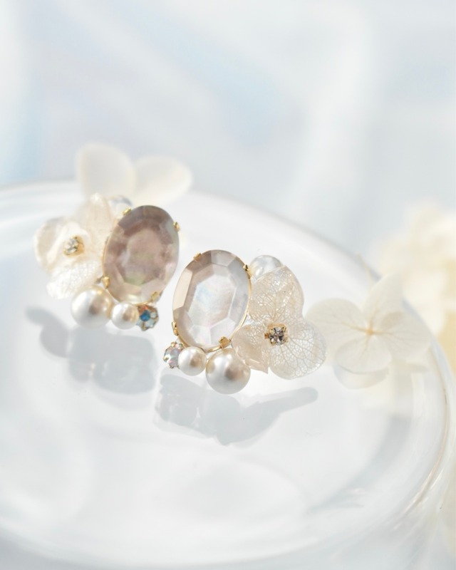 ❁ピアス・イヤリング (受注生産 この耳飾りは、 あなたの“心の奥”をそっと映すためのもの。 ラメホワイトの紫陽花は、 浄化と再生を象徴する花。 光を受けるたびに放つきらめきは、 滞っていた感情を静かにほどいてくれます。 中心に添えたのは、 私の手で生まれたシェル風カボション。 まるで魂の層を映し出すかのように、 見る角度によって表情を変え、 今のあなたに必要なメッセージを映します。 パールは「守り」と「女性性」の象徴。 ビジューは内なる光を呼び覚まし、 本来のあなたへとそっと還してくれる存在。 ホワイトパールカラーは、 身につける人のエネルギーをやさしく整え、 不要になった感情や思い込みを そっと洗い流してくれます。 迷ったとき。 心が曇ったとき。 この耳飾りが、 あなた自身の本音と向き合うための 心の鏡になりますように。 ※手作りの為 誤差が有ります。 サイズ 全長約20mm 重さ2g 金属アレルギー対応。 使用後は他の金具部分を柔らかい布(メガネ拭き等)で優しく拭き取っていただけますと綺麗になります。長く綺麗な状態を保つことができます。