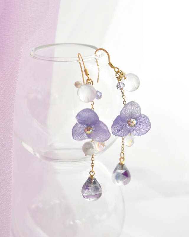 ❁ピアス・イヤリング (受注生産 言葉にできない気持ちが、 心の中に残ることがある。 嬉しいのか、悲しいのか、 強いのか、弱いのかも分からない。 ただ、消えずにそこに在る想い。 この耳飾りは、 そんな**「名づけられない感情」**に そっと寄り添うために生まれました。 白く透ける紫陽花は、 感情を押し込めることも、 無理に咲かせることもしない花。 光を集める透明な雫と、 静かに揺れるチェーンが、 あなたの中の揺らぎを そのまま肯定してくれます。 強くならなくていい。 答えを出さなくてもいい。 ただ、 今の自分の気持ちを 「ここに在っていい」と 思えたなら。 それだけで、 心は少し軽くなるのかもしれません。 “綺麗”のためだけじゃない。 感情の居場所になるアクセサリーを。 ※手作りの為 誤差が有ります。 サイズ 全長約75mm 重さ3g 金属アレルギー対応。 使用後は他の金具部分を柔らかい布(メガネ拭き等)で優しく拭き取っていただけますと綺麗になります。長く綺麗な状態を保つことができます。