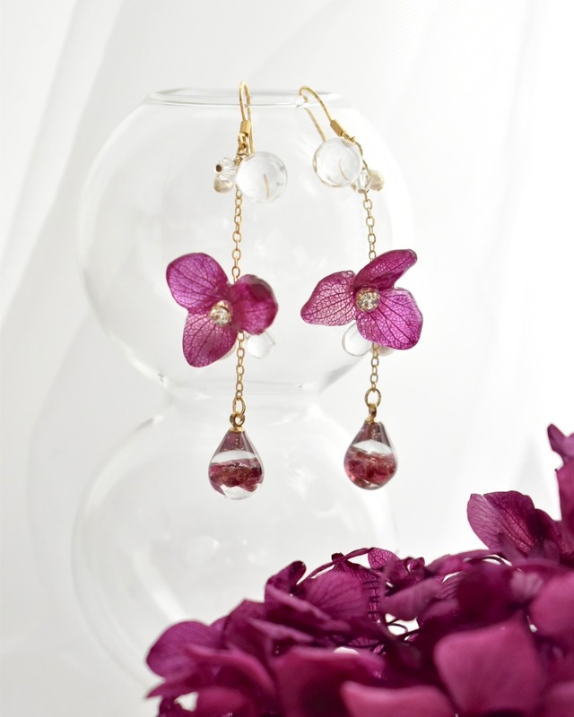 ❁ピアス・イヤリング (受注生産) 紫陽花とスワロフスキービジュー、 パールを組み合わせた耳飾りシリーズです。 淡いピンクと深みのあるピンクが重なり、 まるで光を閉じ込めた雫のような色合いです。 熟した果実のような、 ほんのりプラムを感じるピンク。 今回この“ピンク”が生まれたのは、 ピンクがお好きなお客様から 「ピンク色もお待ちしております」と お声を届けていただいたことがきっかけでした。 合わせるストーンの色にも、 何度も迷いながら、 ようやく「これだ」と思える組み合わせに。 私自身も、 すっかりお気に入りのひとつです。 まるで“ときめきの欠片”のように輝くビジューと、 やさしく寄り添う紫陽花を合わせることで、 耳元に上品なきらめきを添えました✨ スワロフスキーは、ものづくりを始めた約10年前から 少しずつ集めてきた思い入れのある煌めきの欠片。 光を吸い寄せてキラキラと瞬くのは、 スワロフスキーの透明感と、 特別に調合した色をのせた紫陽花のおかげです。 視線を耳元に送るたび、 光と色が混ざり合い、日常をそっと特別に彩ります。 大切な自分へのご褒美にも、 ギフトにもおすすめのデザインです♡ 素材:スワロフスキー、パール、花、金具(アレルギー対応) サイズ:約2.5cm / 約2g ご使用後は金具部分を柔らかい布(メガネ拭き等)で 優しく拭いていただくと、長く美しい状態を保てます。