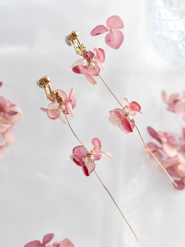 ❁ピアス・イヤリング (受注生産) 本物の紫陽花です。 じゅわっと血色カラーのピンク紫陽花で 立体感のある耳飾りを仕立てました。 思わず「綺麗な色だね…」と会話が生まれてしまいそうですよね。 そんな会話のきっかけにもなって欲しいなと 願いを込めてデザインしています。 ※自然の物の為 誤差が有ります。 サイズ 全長3.5cm 重さ 3g 金属アレルギー対応。 ハート/タッセル/金属アレルギー/金/ゴールド/雫 使用後は他の金具部分を柔らかい布(メガネ拭き等)で優しく拭き取っていただけますと綺麗になります。長く綺麗な状態を保つことができます。