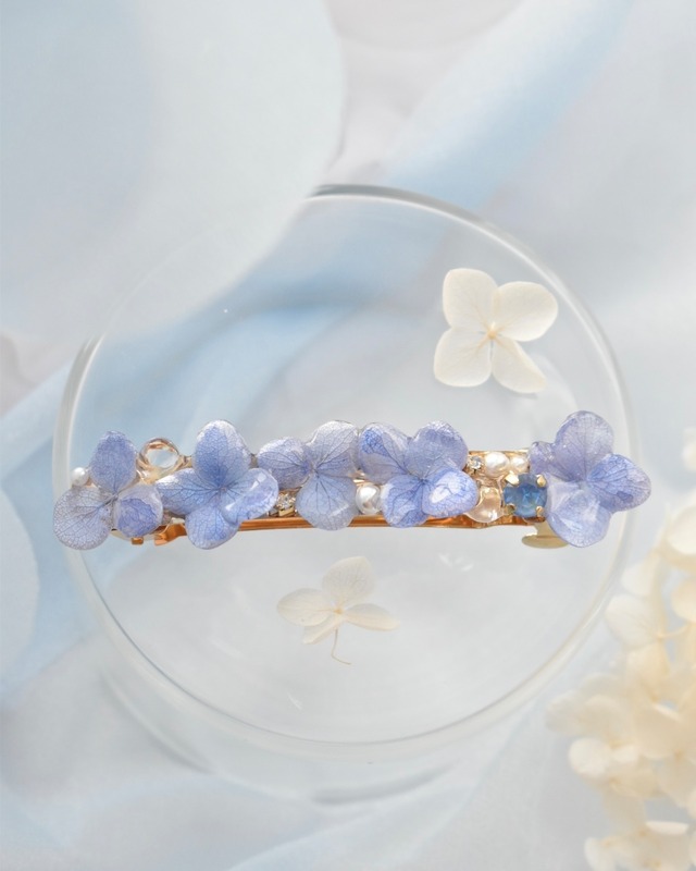 ❁ヘアクリップ・バレッタ(受注生産) 雨の日も、曇りの日も。 紫陽花がいちばん綺麗に咲く日。 **「紫陽花日和」**は、 そんな“紫陽花にとっての良い日”を 髪飾りにしたシリーズです。 本物の紫陽花を一枚一枚丁寧に加工し、 ふわっと重なる花びらに ビジューやパールのきらめきを添えました。 派手すぎず、でも埋もれない。 王道の綺麗可愛い中に、 calin.らしいやさしさを閉じ込めています。 まとめ髪にさっと留めるだけで、 後ろ姿までやさしく、上品に。 日常にも、少し特別な日にも 季節を纏うようにお楽しみください。 ※本物のお花を使用しているため、 色合いや配置には個体差があります。 世界にひとつだけの表情として ご理解いただけましたら幸いです。 こちらは【白雫】カラーです。 紫陽花の持つ表情の中から、 その色ならではの魅力を引き出しました。 ※自然の物の為 誤差が有ります。 サイズ 全長85mm 重さ11g 金属アレルギー非対応。 使用後は他の金具部分を柔らかい布(メガネ拭き等)で優しく拭き取っていただけますと綺麗になります。長く綺麗な状態を保つことができます。