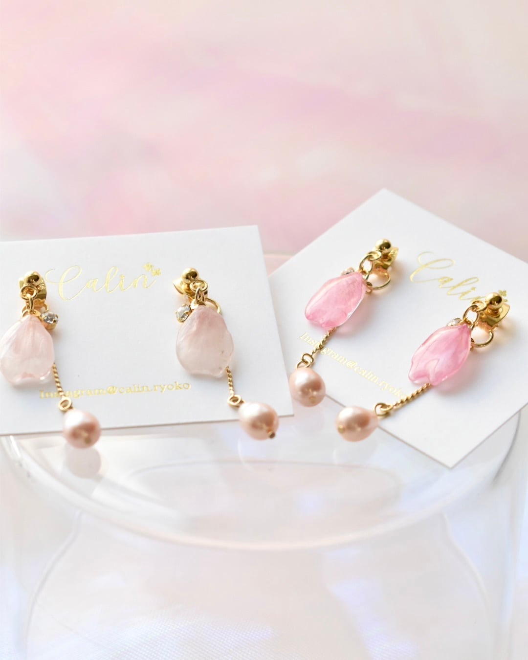 ❁ピアス・イヤリング (受注生産 金属金具(樹脂ピアス以外)は2wayデザインです。 画像3枚目をご覧下さい♡ 咲いた桜から、 ひらりと花びらが舞い降りる。 満開の桜の下で 風に揺れる花びらの一瞬を閉じ込めたような 軽やかな耳飾りです。 2枚の花びらがチェーンに揺れ、 動くたびに表情が変わる繊細なデザイン。 光を受けてやわらかくきらめく姿は まるで春の風景そのもの。 顔まわりをぱっと明るく見せてくれる存在感がありながら、 淡い桜色とパールの組み合わせで 甘くなりすぎない上品さに仕上げました。 ふと鏡を見たとき 「今日のわたし、ちょっと好きかも」って思えるような そんな小さなときめきを添えてくれる桜です。 特別な日にも、 いつもの日にも。 気持ちまでやわらかく整えてくれる存在に。 主役の桜にそっと視線を送るように、 あなたの横顔をやさしく彩ります。 ・揺れるたび、春が舞う ⸻ ■ サイズ 全長:約65mm 重さ:約3g 金属アレルギー対応。 使用後は他の金具部分を柔らかい布(メガネ拭き等)で優しく拭き取っていただけますと綺麗になります。長く綺麗な状態を保つことができます。