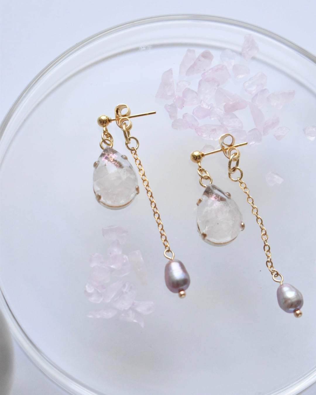 雫型のレジンに浮かぶやわらかな輝きと、後ろで揺れる淡水パールが、耳元で静かに優しさを奏でます。