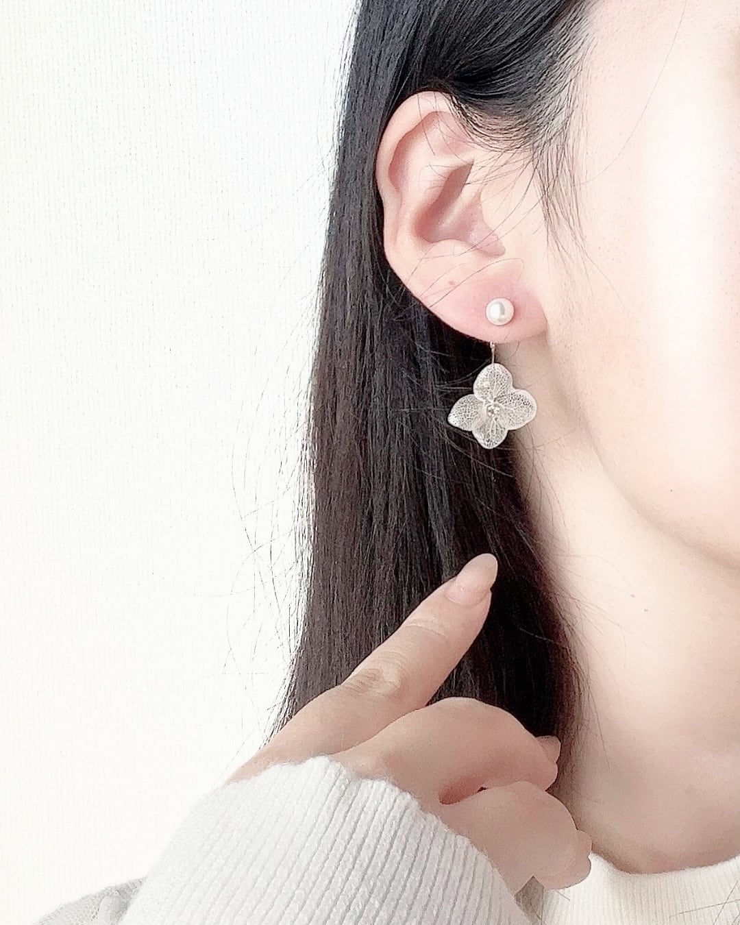 6mmのパールをトップに、下には4枚の紫陽花をあしらった耳飾りです。