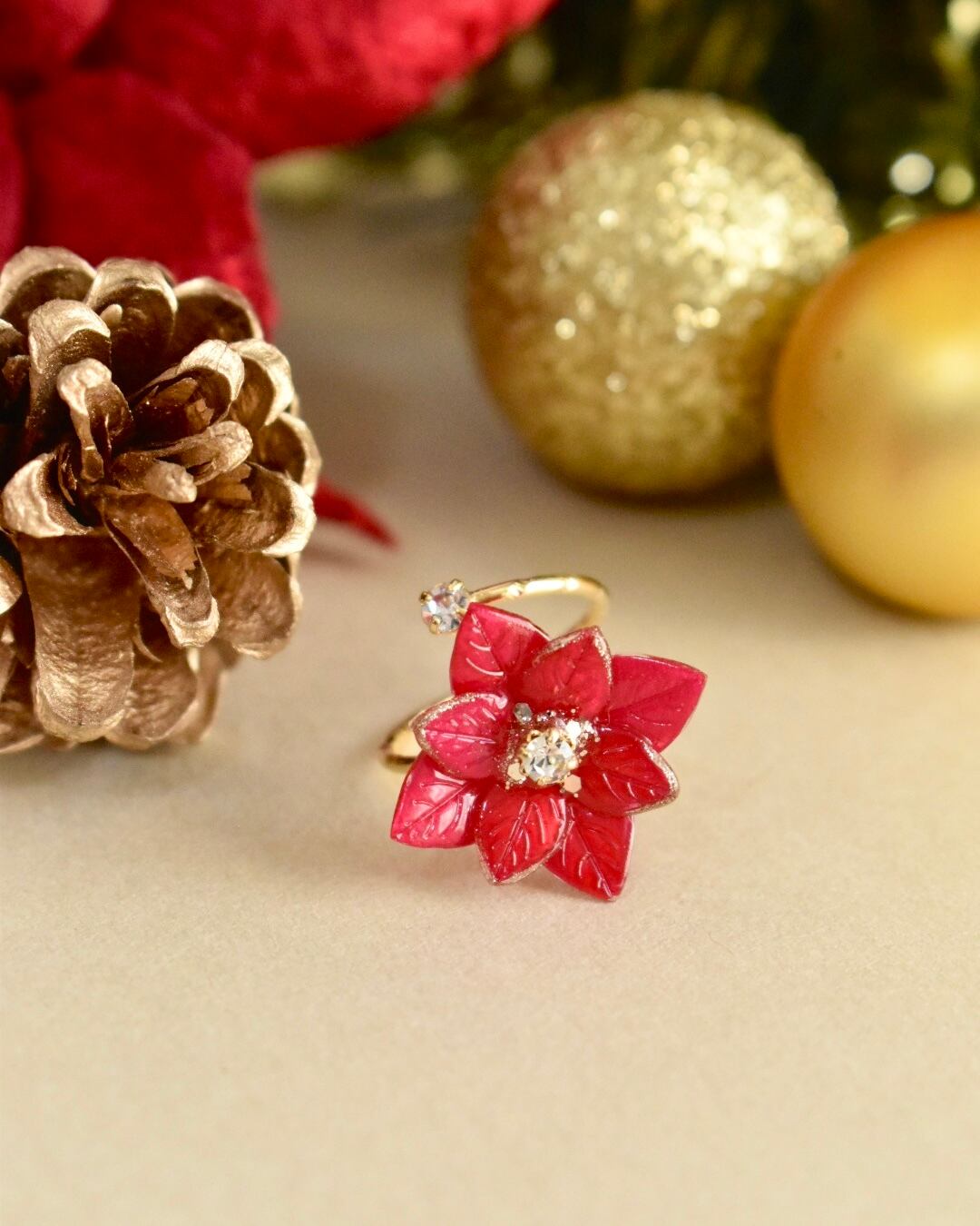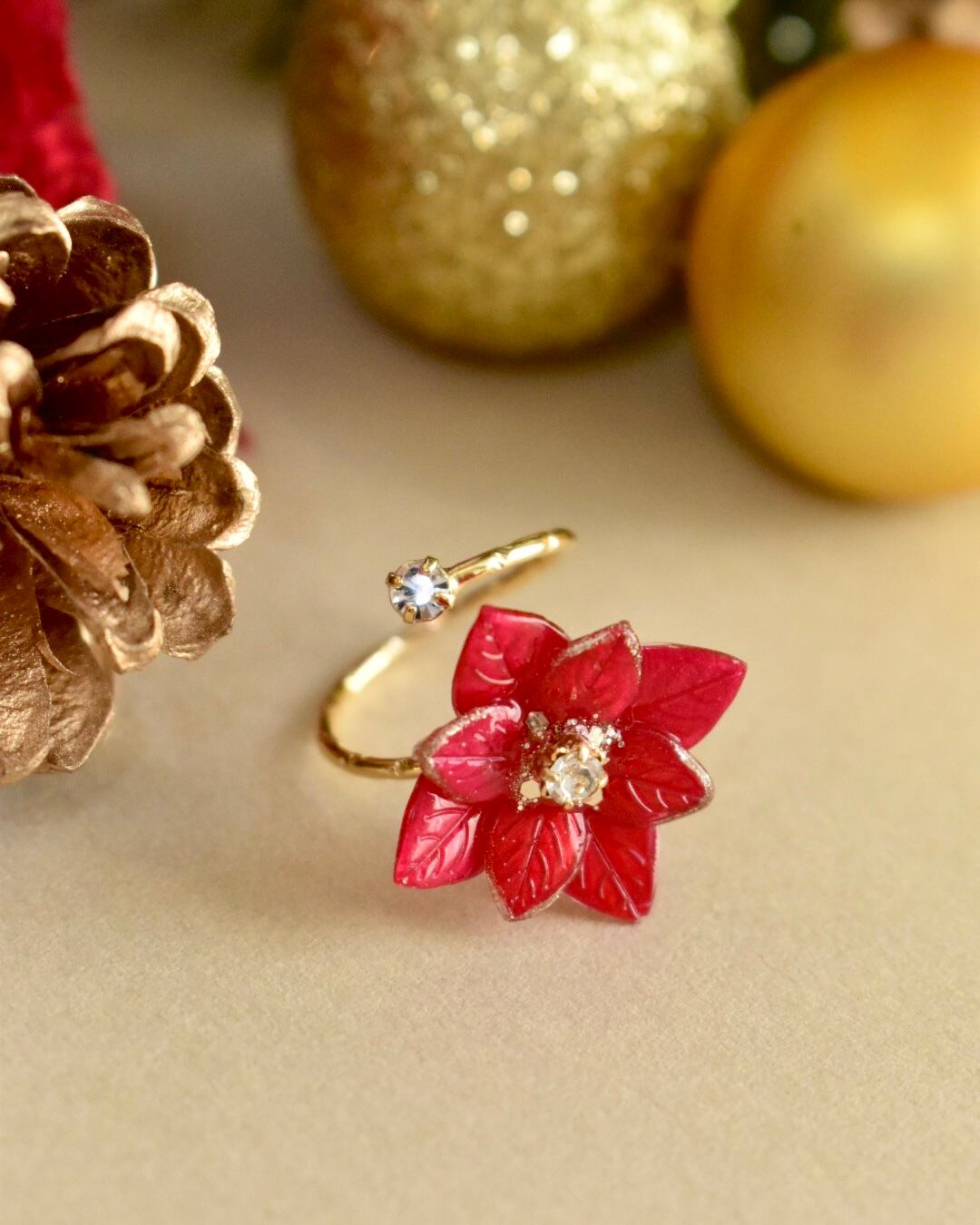 あなたの幸せを祈る灯り – 赤いポインセチアの指輪(k16gp)